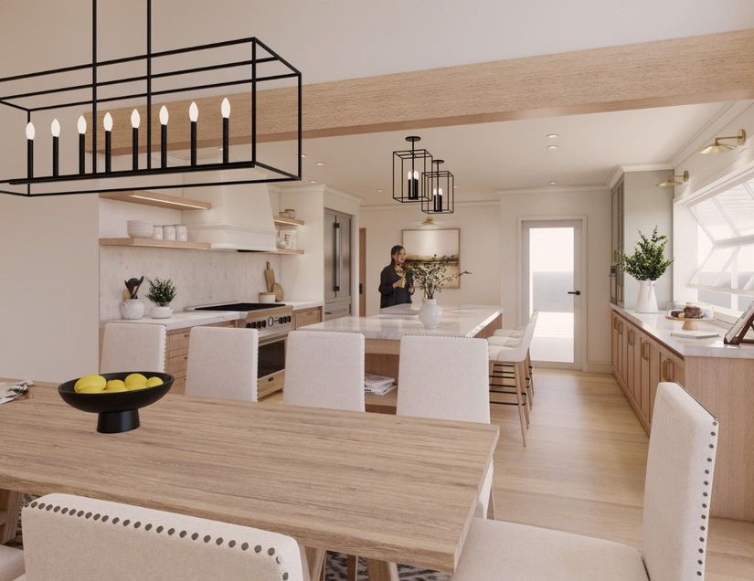 Inside, the design pairs rustic authenticity with modern refinement. Natural wood tones, crisp white surfaces, and matte black accents create a palette that feels both classic and current. Expansive windows and open sightlines invite natural light deep into the home, enhancing its airy, welcoming atmosphere. The result is a residence that beautifully bridges traditional charm and modern sensibility — a serene retreat that embodies the relaxed sophistication of Southern California living.