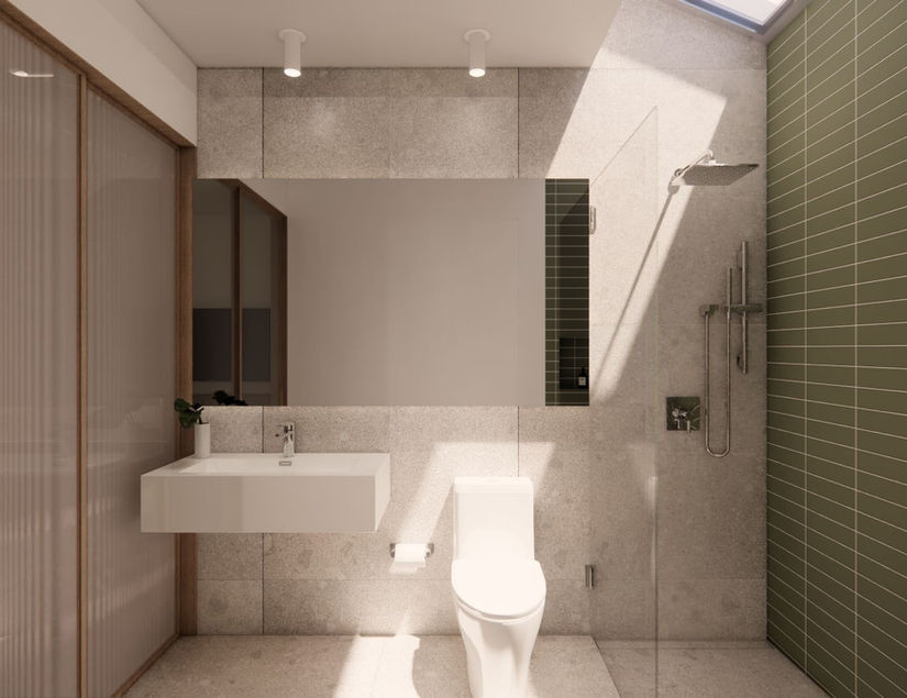 The main living areas are wrapped in creamy tan finishes, lending warmth and lightness throughout the interiors. Subtle green accents introduced through muted fixtures and doors—add a refreshing contrast without disrupting the overall calm. In the bathroom, muted green walls bring a sense of freshness and grounding, creating a moment of gentle pause within the compact space.