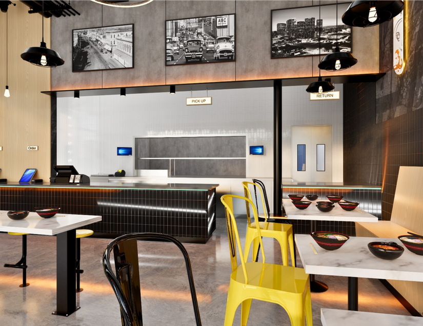 The interior functionality is defined by a clean, minimalist service counter clad in dark, textured tiles with integrated LED accent lighting, clearly designated by "Order," "Pick Up," and "Return" signage. Above the service area, large-scale black-and-white photography depicting vintage urban scenes adds a sense of history and "street" authenticity to the space. Attention to detail is evident in the precise integration of modern amenities, from the streamlined digital ordering kiosks to the carefully placed pendant lighting that creates an inviting atmosphere for diners seeking both quality ramen and a high-energy, visually engaging environment.