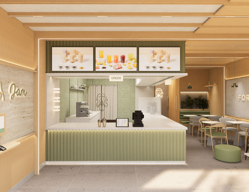 The walls of Jam Jam Tea are painted in a tranquil shade of gray, evoking a sense of calmness and serenity. This neutral backdrop serves as the perfect canvas for the light green accents to stand out, while also providing a sophisticated and modern backdrop for the tea shop's aesthetic. Adding a refreshing pop of color to the space are the light green accents found on both the walls and furniture. Whether it's subtle touches of green on throw pillows, upholstery, or decorative items, these accents infuse the space with a sense of vitality and rejuvenation, mirroring the fresh and invigorating flavors of the teas served.