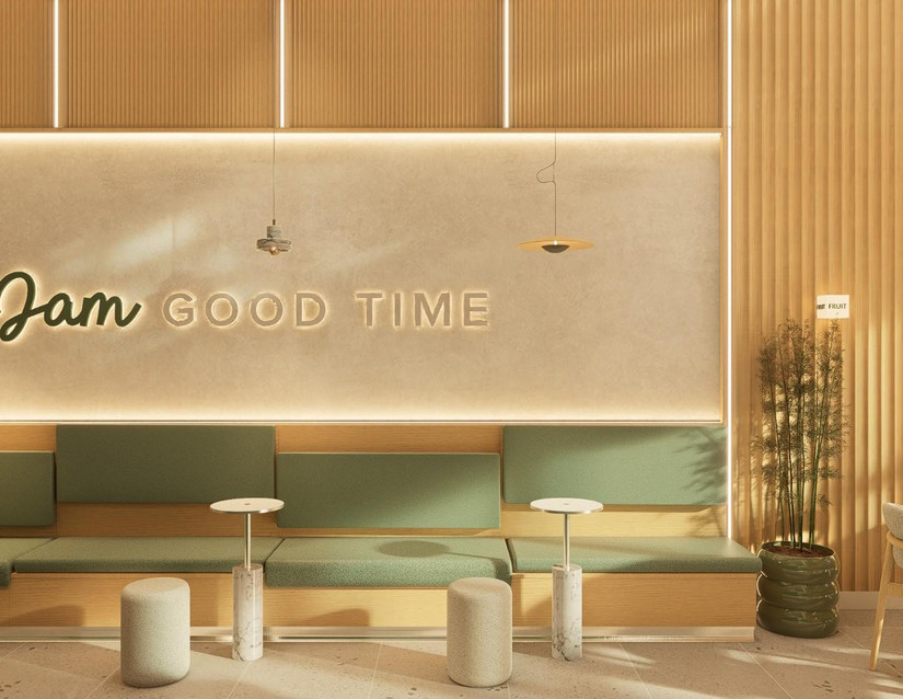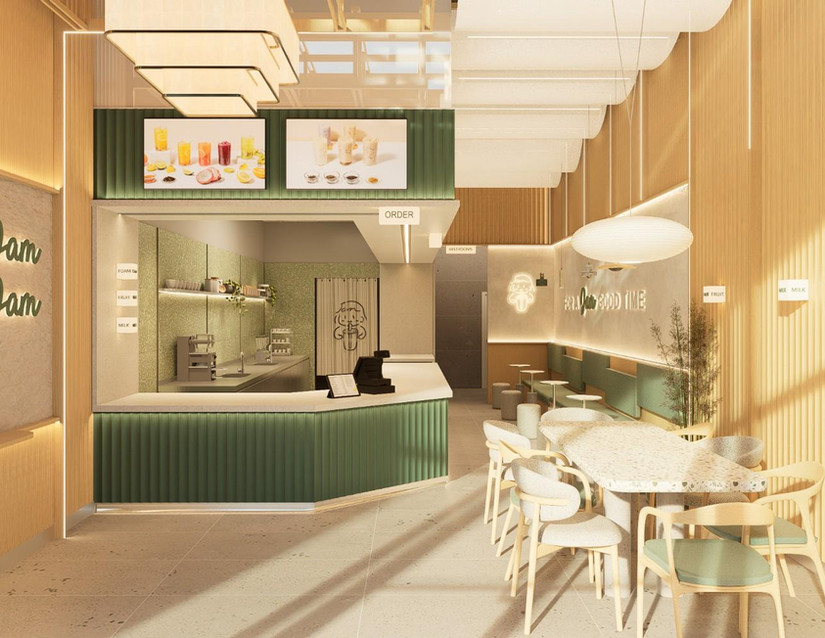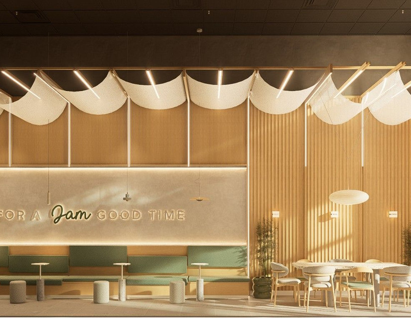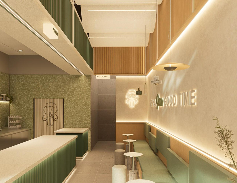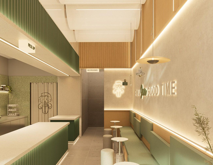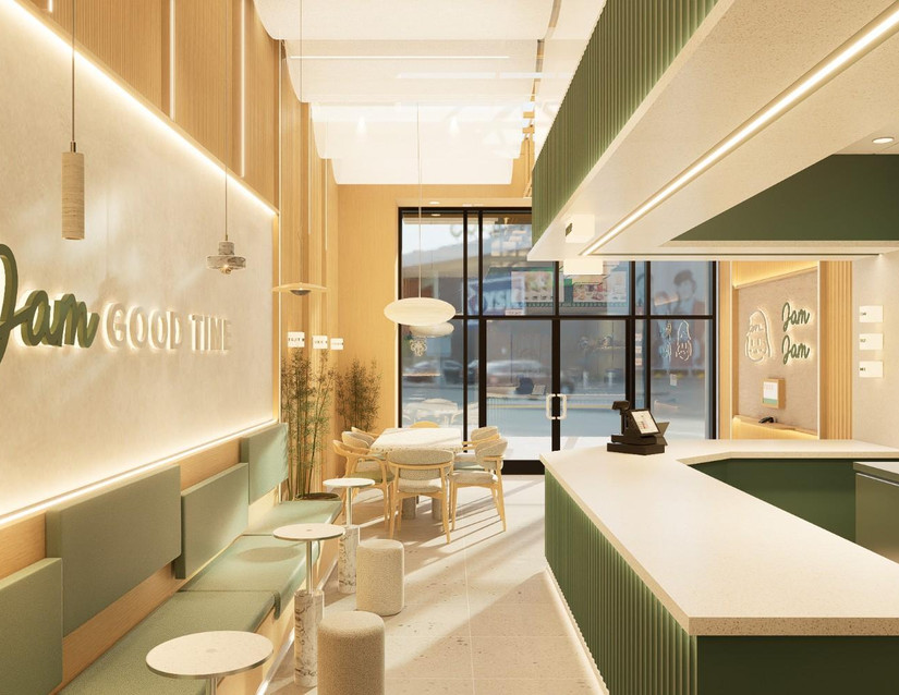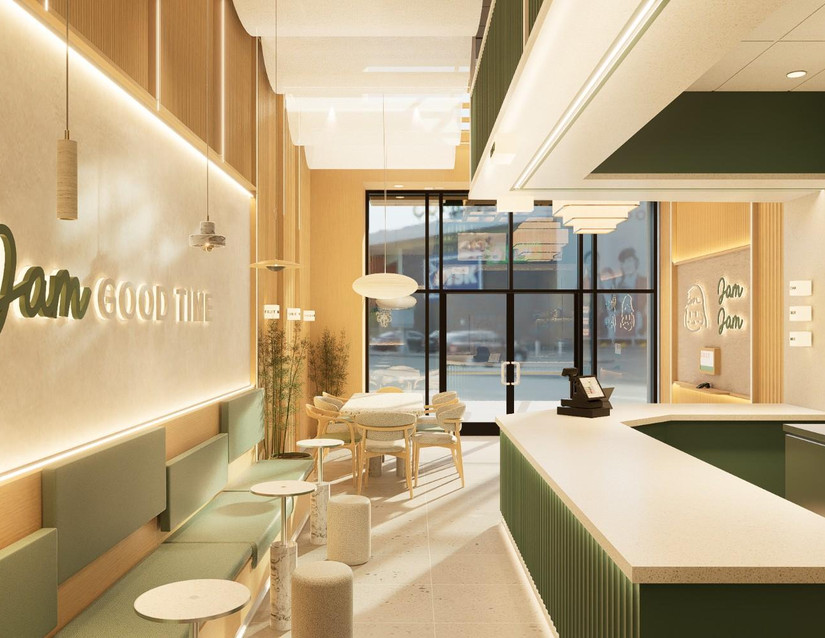 The walls of Jam Jam Tea are painted in a tranquil shade of gray, evoking a sense of calmness and serenity. This neutral backdrop serves as the perfect canvas for the light green accents to stand out, while also providing a sophisticated and modern backdrop for the tea shop's aesthetic. Adding a refreshing pop of color to the space are the light green accents found on both the walls and furniture. Whether it's subtle touches of green on throw pillows, upholstery, or decorative items, these accents infuse the space with a sense of vitality and rejuvenation, mirroring the fresh and invigorating flavors of the teas served.