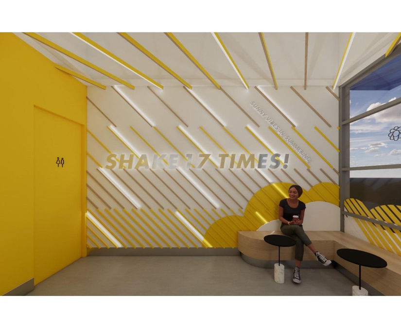Is a vibrant and inviting establishment that aims to create a warm and energetic atmosphere reminiscent of a sunny day with billowing clouds and radiant sun rays. The design concept revolves around evoking feelings of joy, optimism, and comfort, making guests feel welcome and uplifted as soon as they step through the door.